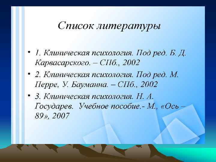 Литература 1. Александровский Ю. А. Пограничные психические расстройства, М, Медицина, 2000. 2. Блейхер В. М. Клиническая патопсихология. М. , 1980. 3. Дроздов А. А. Полный справочник психотерапевта, М, Эксмо, 2007. – 704 с. 4. Зейгарник Б. В. Патопсихология, М, Академия, 2005. – 208 с. 5. Зозуля Т. В. Основы социальной и клинической психиатрии, М, Академия, 2001. – 224 с. 6. Карвасарский Б. Д. Клиническая психология, СПб, Питер, 2006. – 960 с. 7. Корсакова Н. К. , Московичюте Л. И. Клиническая нейро психология М. , 1988. 8. Кулаков С. А. Практикум по клинической психологии и психотерапии подростков, СПб, Речь, 2004. – 464 с.