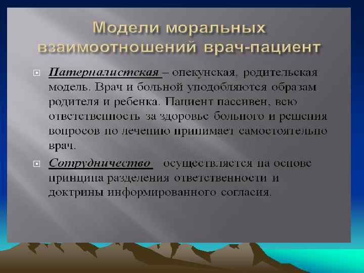 Этика в клинической психологии. Модель Гиппократа (принцип «не навреди» ) Модель Парацельса (принцип «делай добро» ) Деонтологическая модель (принцип «соблюдения долга» ) Биоэтика (принцип «уважения прав и достоинства личности» )