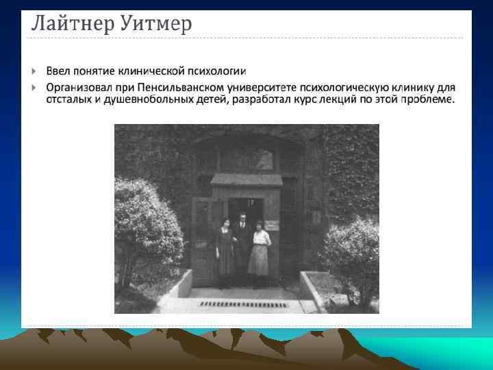 История клинической психологии Сам термин «клиническая психология» появился в 1896 году, когда американский психолог Лайтнер Уитмер (Ligthner Witmer), обучавшийся в Институте экспериментальной психологии В. Вундта, по возвращении из Лейпцига основал первую в мире психологическую клинику при университете штата Пенсильвания в США