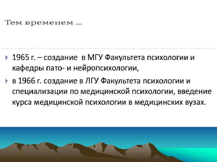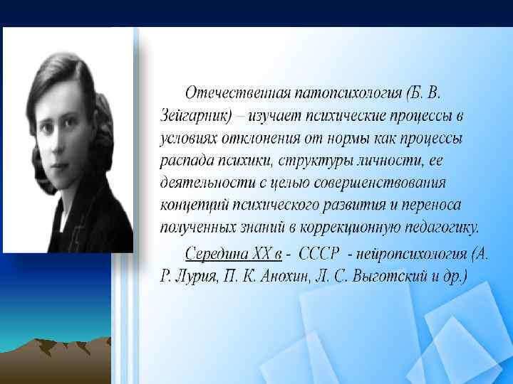 Направления нейропсихологии q q q q Клиническая нейропсихология Экспериментальная нейропсихология Реабилитационная нейропсихология Психофизиология локальных поражений мозга Нейропсихология нормы и индивидуальных различий Детская нейропсихология Нейропсихология позднего возраста (геронтонейропсихология). q Экологическая нейропсихология