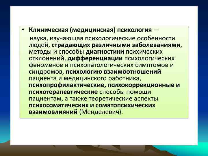 • Клиническая психология (от греч. kline — постель, койка и psyche — душа + logos — учение)– раздел психологии на стыке с психиатрией, изучающий психические явления с точки зрения их взаимосвязи с болезнями