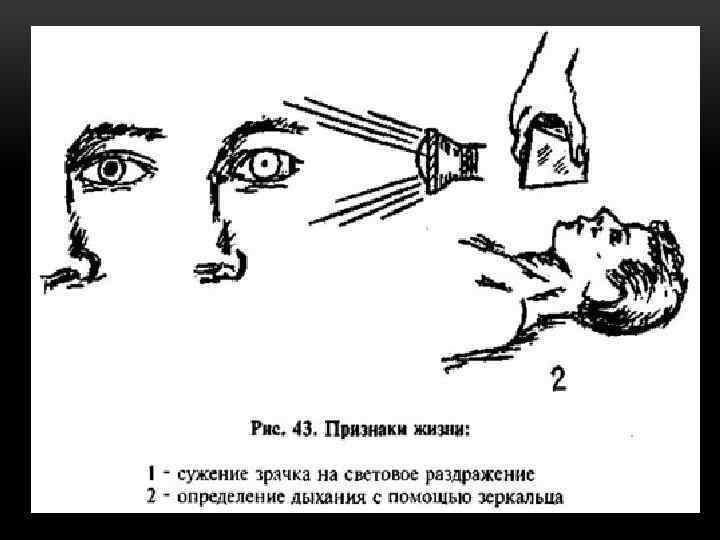 ПРИЗНАКИ КЛИНИЧЕСКОЙ СМЕРТИ широкие зрачки и отсутствие их реакции на свет.
