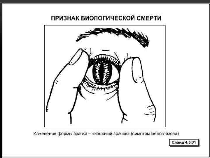 • Достоверные признаки: • «Симптом кошачьего зрачка» – наиболее ранний признак, появляется через 15 минут. При сдавливании пальцами глазного яблока в вертикальном или горизонтальном направлении, зрачок принимает узкую овальную форму. • Высыхание и помутнение роговицы глаза.