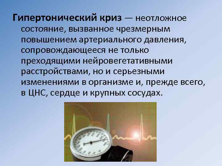 Гипертонический криз — неотложное состояние, вызванное чрезмерным повышением артериального давления, сопровождающееся не только преходящими нейровегетативными расстройствами, но и серьезными изменениями в организме и, прежде всего, в ЦНС, сердце и крупных сосудах.