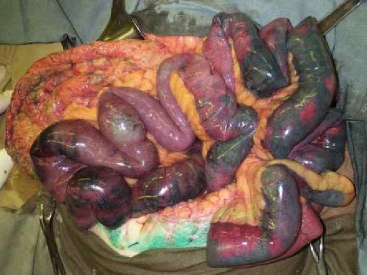 После диагностической лапароскопии пациенту делают лапаротомию. Операция: лапаротомия, ревизия, дренирование брюшной полости (16. 50) • Диагноз до операции: мезентериальный тромбоз • Диагноз после операции: острый мезентериальный тромбоз в бассеине верхней и нижней брыжеечных артериях, фаза ишемии