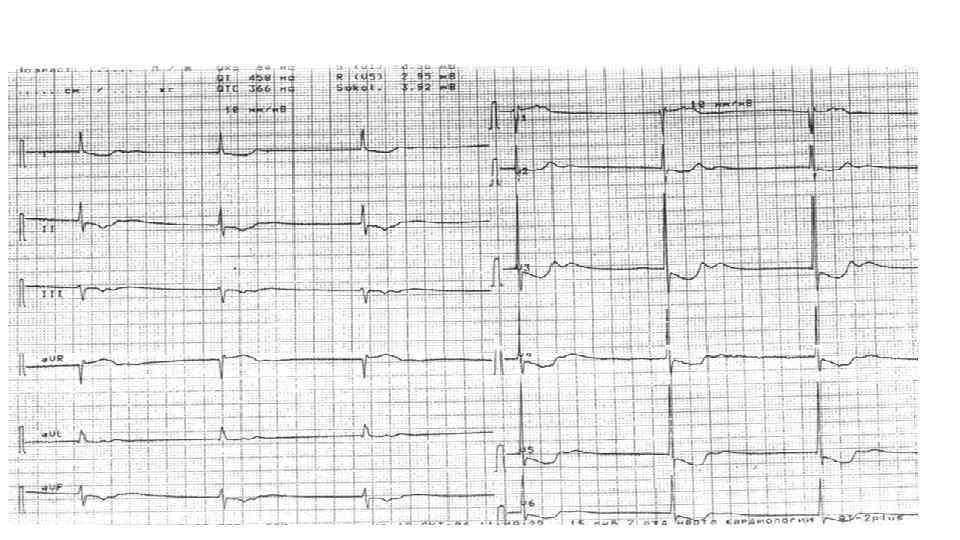ЭКГ • ЭКГ: синусовая брадикардия (ЧСС 36 в мин), замедление атриовентрикулярной проводимости. • Диффузные изменения желудочковой реполяризации с проведением T волны от V 1 до V 5; QT = 0, 435 с (норма 0, 12 -0, 18 с)