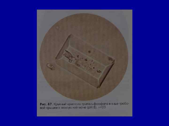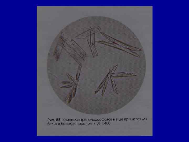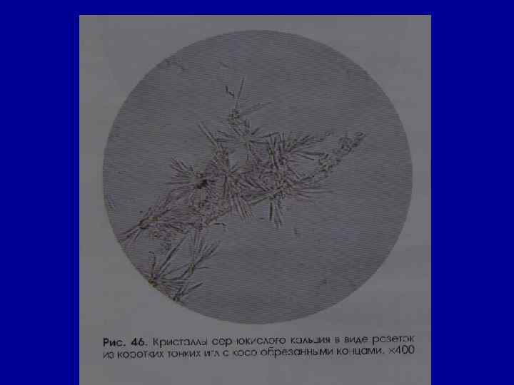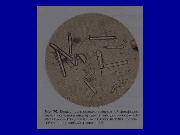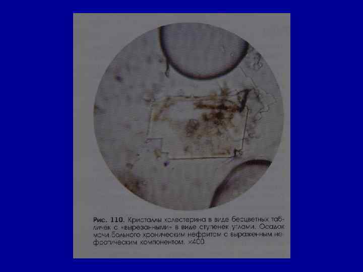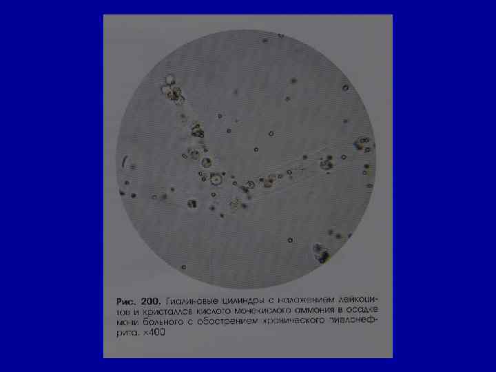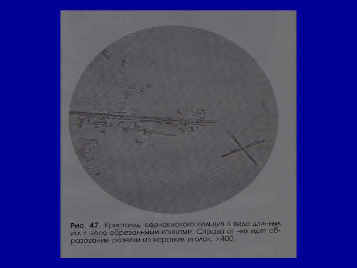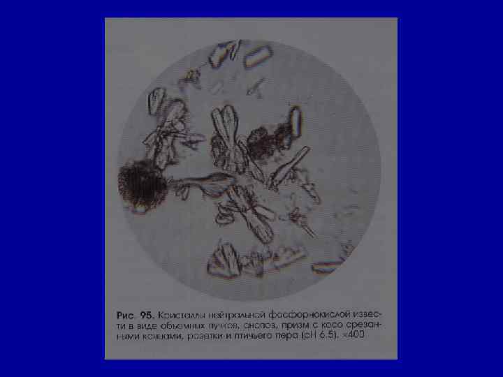 Микроскопическое исследование осадка Соли РН мочи Причины Кристаллы цистина как кисл. , так и щел. в норме- нет цистиноз (врожденное нарушение обмена аминокислот) Кристаллы лейцина, тирозина -//- в норме- нет острая жировая дистрофия печени, лейкоз, оспа, отравление Р 3+ Кристаллы холестерина -//- в норме- нет амилоидная, липоидная дистрофия почек, эхинококкоз мочевых путей, новообразования, абсцесс почек Жирные кислоты -//- в норме- нет жировая дистрофия, распад эпителия почечных канальцев