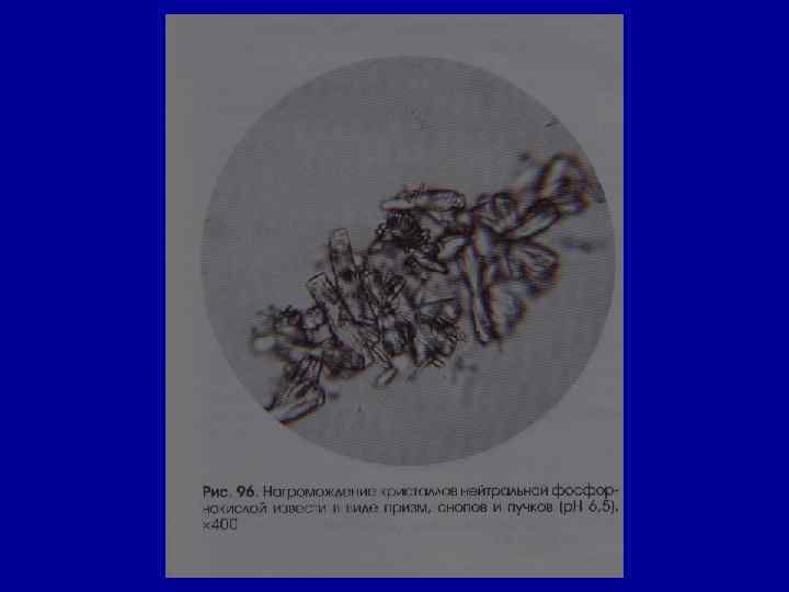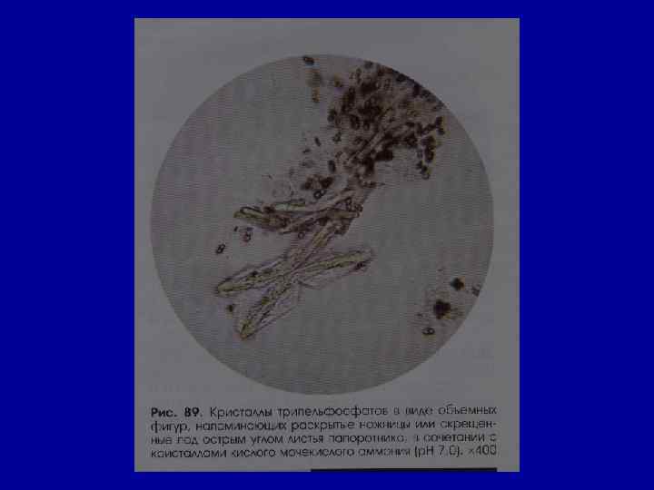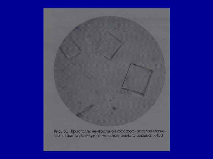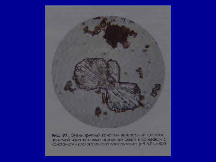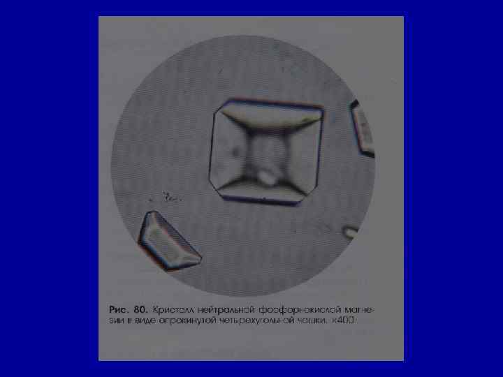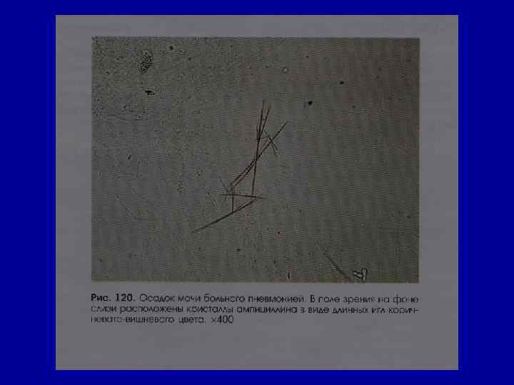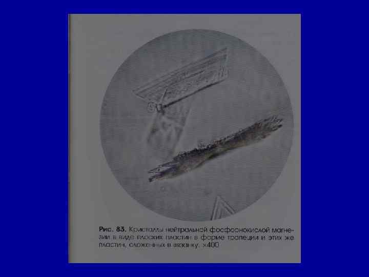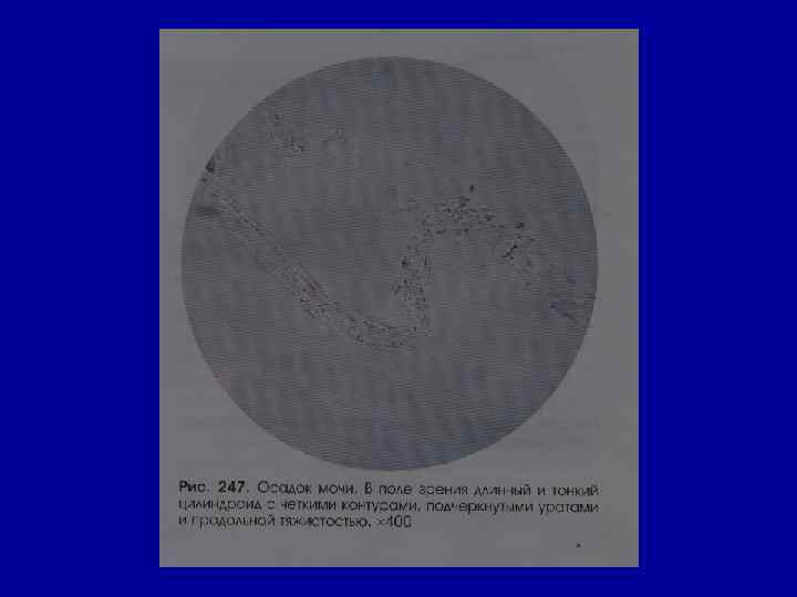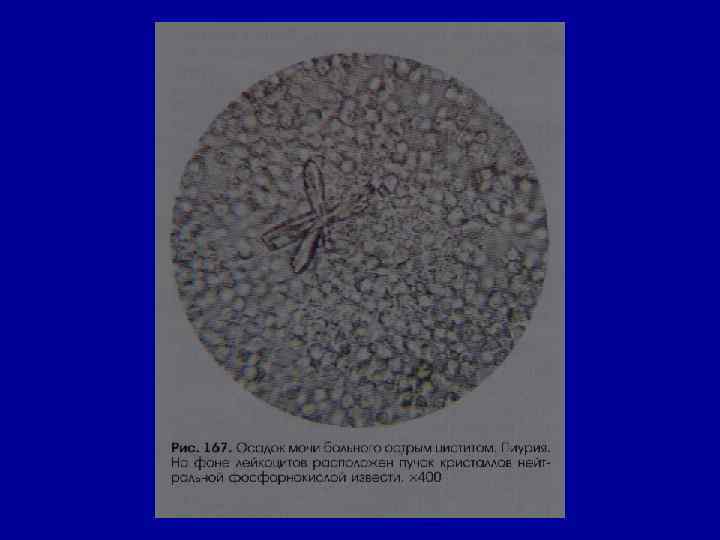 Микроскопическое исследование осадка Соли РН мочи Причины Кристаллы цистина как кисл. , так и щел. в норме- нет цистиноз (врожденное нарушение обмена аминокислот) Кристаллы лейцина, тирозина -//- в норме- нет острая жировая дистрофия печени, лейкоз, оспа, отравление Р 3+ Кристаллы холестерина -//- в норме- нет амилоидная, липоидная дистрофия почек, эхинококкоз мочевых путей, новообразования, абсцесс почек Жирные кислоты -//- в норме- нет жировая дистрофия, распад эпителия почечных канальцев