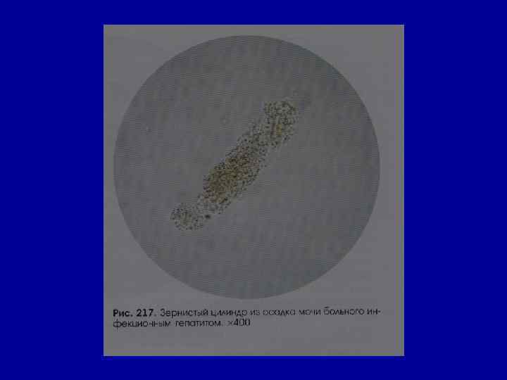 Микроскопическое исследование осадка Цилиндры Цилиндрурия – первый признак реакции со стороны почек на общую инфекцию, интоксикацию или наличие изменений в самих почках Типы цилиндров Состав Причины Гиалиновые белковая основа покрыта солями или клетками - неорганические поражения почек слущивающиеся и склеенные друг с другом клетками канальцев нефрозы, некронефрозы (сулемовый), нефриты эпителиальные клетки канальцев, образуются при наличии в них дегенерации органические заболевания почек, нефротический синдром, пиелонефрит Эпителиальные (поражение тубулярного аппарата) Зернистые (ортостатическая, застойная, физических нагрузок ПУ, охлаждение, лихорадка) - органические поражения почек (острые, хронические)