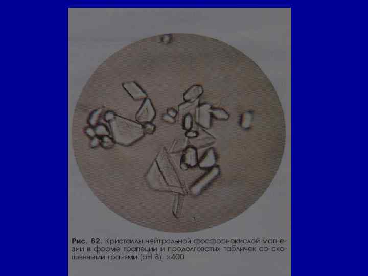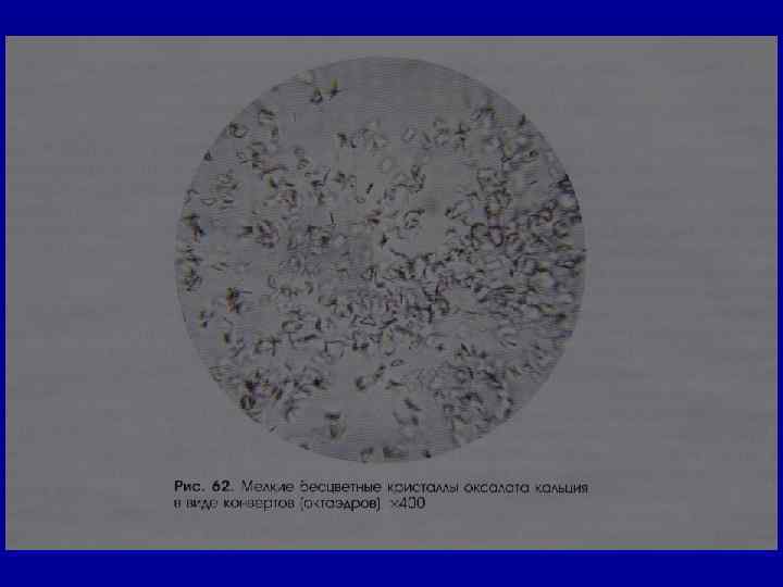 Микроскопическое исследование осадка Соли РН мочи Причины Мочевая кислота 5, 0 ПН, лихорадка, лейкозы, распадающиеся опухоли, тяжелая физическая нагрузка, мочекислый диатез, употребление исключительно мясной пищи Аморфные ураты (мочекислые соли) 5, 0 в норме - единичные в п/зр, в больших кол-вах - ОГН, ХПН, застойная почка, лихорадка Оксалаты (соли щавелевой кислоты) 5, 0 в норме - единичные в п/зр, в больших кол-вах – пиелонефрит, сахарный диабет, нарушение обмена Са 2+ , после приступа эпилепсии, употребление большого количества фруктов и овощей Трипельфосфаты нейтральные фосфаты, карбонат Са 2+ 7, 0 в норме- нет цистит, употребление большого количества фруктов и овощей, минеральной воды, рвота Кислый мочекислый аммоний 5, 0 -7, 0 в норме- нет цистит, новорожденные и грудные дети, мочекислый инфаркт почек у новорожденных