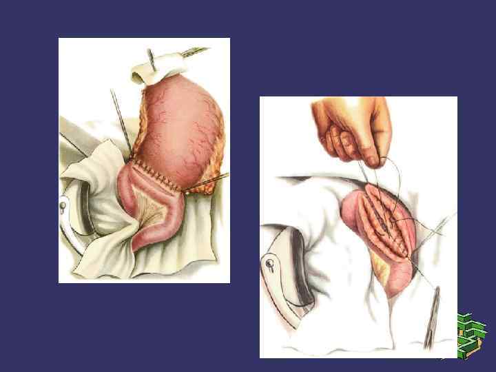 Приводящая петля не должна быть короче 10— 12 см во избежание ее натяжения. Концы нитей наложенных швов срезают, за исключением крайних, которые в дальнейшем используют как держалки. Брюшную полость отгораживают салфетками. С пилорического отдела желудка снимают жом и аспиратором отсасывают содержимое. Отступя на 0, 5— 0, 7 см от линии швов, рассекают стенку тонкой кишки и из ее просвета марлевыми шариками удаляют содержимое. Затем на таком же расстоянии от линии швов отсекают желудок. После этого через все слои стенки кишки и желудка накладывают непрерывный кетгутовый шов на задние губы анастомоза. Передние губы анастомоза сшивают скорняжным швом, поверх которого накладывают ряд узловых серозно мышечных швов.