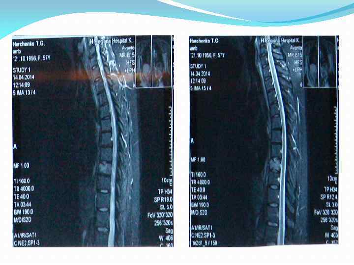 МРТ(superstar T 0, 35; Қостанай к. ) Ұйғарым: МР-белгілер Д 9 омыртқа денесінің гемангиомасы мен компрессиясына тән. Кеуде бөлімінде дегенеративті-дистрофиялық өзгерістері, екі жақты Д 6, Д 7, Д 8, Д 9 деңгейінде қабырға-омыртқалық буынның артрозы.