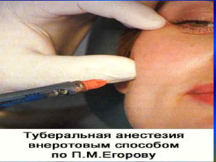 Туберальная анестезия • При туберальной анестезии блокируют верхние задние альвеолярные ветви, которые располагаются в крыловидно-небной ямке и на задненаружной поверхности бугра верхней челюсти. На 18— 25 мм выше края альвеолы верхнего третьего большого коренного зуба, соответственно середине коронки его в области бугра верхней челюсти, имеется несколько отверстий. Через них верхние задние альвеолярные ветви входят в костную ткань. При туберальной анестезии необходимо ввести раствор анестетика соответственно расположению этих отверстий или несколько выше их.
