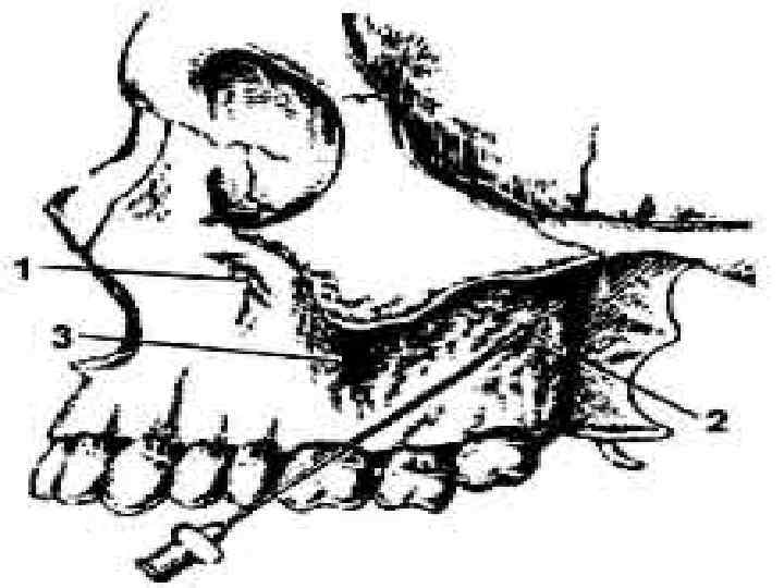 Подглазничная (инфраорбитальная) анестезия Внеротовой При внеротовом способе инфраорбитальной анестезии иглу вкалывают над подглазничным отверстием до кости, кончиком иглы отыскивают это отверстие, затем вводят в него иглу и продвигают ее по подглазничному каналу на глубину от 0, 8 до 1, 0 см, куда и выпускают медленно 1, 5 -2 мл анестетика. Направление шприца и иглы аналогично таковому при внутриротовом способе. Зона обезболивания с губо-щечной стороны захватывает резцы, клык и первый премоляр, а также соответствующий участок слизистой оболочки десны верхней челюсти. Кроме того, анестезируется соответствующая сторона верхней губы, крыло носа и передняя часть щеки. Проводниковое обезболивание на нижней челюсти именуется мандибулярной анестезией, однако такое название не соответствует сути, так как у отверстия нижней челюсти выключают его периферические ветви - нижний луночковый и язычный нервы наверх Внутриротовой При внутриротовом способе иглу вкалывают в переходную складку над боковым верхним резцом соответствующей стороны, а затем продвигают вверх и латерально к прощупываемому подглазничному отверстию Это отверстие находится на 0, 5 см ниже середины нижнеглазничного края. Шприц располагают косо на уровне верхнего центрального резца противоположной стороны. По мере продвижения иглы на глубину 1, 5 -2, 0 см в месте топографии подглазничного отверстия вводят 1, 5 -2 мл раствора анестетика. Зона анестезии включает передние и средние верхние альвеолярные нервы, отходящие от нижнеглазничного нерва