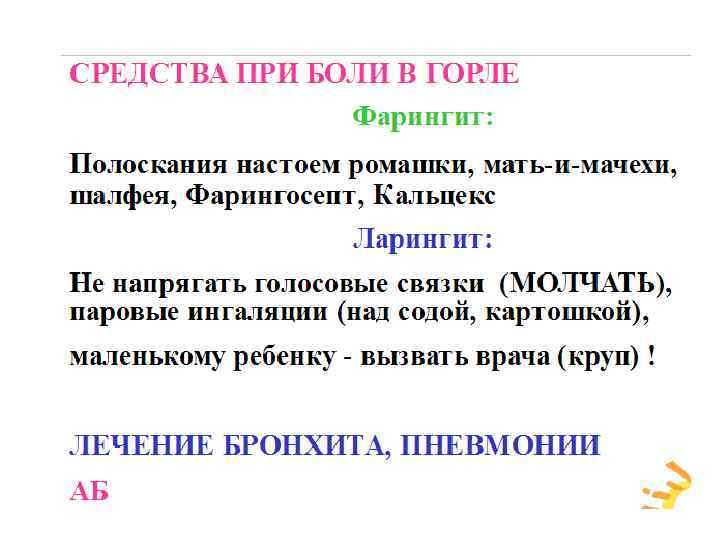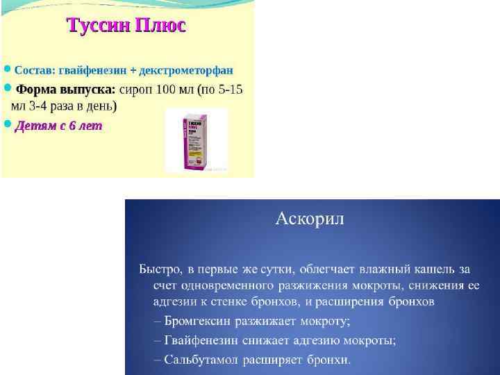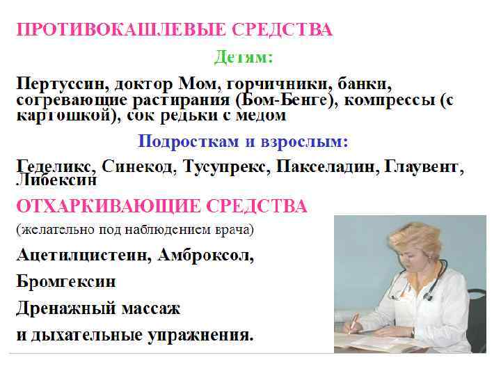 • • • Обязательным компонентом терапии первых дней обострения должны быть средства для улучшения проходимости бронхов. Применяют отхаркивающие средства: 1) рефлекторного действия – настой травы термопсиса (из 0, 8 г на 200 мл по столовой ложке через 2– 3 часа), сухой экстракт термопсиса (0, l г 3 раза в день), мукалтин (по 0, 05 г 2– 3 раза в день) 2) непосредственно действующие на слизистую оболочку – калия йодид (в форме 3% раствора по столовой ложке 5– 6 раз в день после еды или с молоком); натрия йодид (10% раствор от 3 до 10 мл ежедневно в/в до 15 введений); аммония хлорид (0, 2– 0, 5 г 3 раза в день); терпингидрат (0, 25 г 3 раза в день), трава чабреца в виде жидкого экстракта (по 15– 30 капель 3 раза в день), ингаляции анисового, эвкалиптового, тимолового эфирных масел