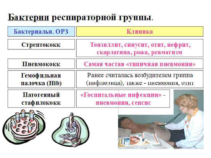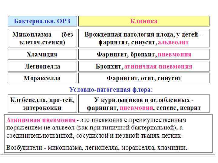 Наиболее часто встречающиеся возбудители внебольничной пневмонии Возбудитель Лечение амбулаторное, %стационарное, %ид, % S. pneumoniae 36, 0 39, 0 21, 6 Н. influenzas 10. 2 6, 2 8, 8 Legionella spp. 0, 4 3, 6 17, 8 S. aureus 0, 8 1, 9 8, 7 M. catarrhalis ? 1, 9 ? Грамотрицательные кишечные бациллы 1, 3 1, 0 1, 6 M. pneumonias 1, 3 10, 8 2, 7 С. pneumoniae 9 13, 1 ? Вирусы 13, 1 12, 8 9, 7 Смешанная флора 11, 0 14, 2 6, 0