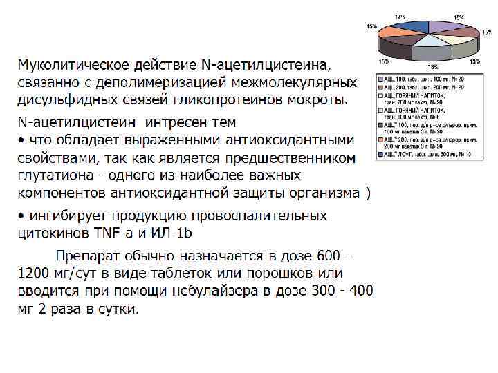 МУКОЛИТИЧЕСКИЕ СРЕДСТВА Ацетилцистеин (acetylcysteine). Муколитик с одновременным отхаркивающим действием: ацетилцистеин применяют в виде ингаляций 20% раствора (по 3 мл 3 раза в день в течение 7– 10 дней). Существуют лекарственные формы для перорального приема, внутримышечного и внутривенного введения. Показания. Затрудненное отделение мокроты (например, при бронхите, пневмонии, бронхоэктатической болезни), БА, муковисцидоз легких, осложнения при операциях на органах дыхания (профилактика). Противопоказания. Гиперчувствительность, БА с нормальным отхождением мокроты. Побочные эффекты. Тошнота. Взаимодействие. Фармацевтически несовместим с антибиотиками, протеолитическими ферментами, металлами, резиной (образуются сульфиды с характерным запахом, поэтому необходимо пользоваться стеклянной посудой). Дозы и применение. Ингаляционно по 2— 5 мл 3— 4 раза/день (в течение 15— 20 мин).