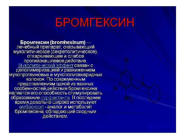 • Амброксол (ambroxol) Лазолван р р д/инг. и приема внутрь (флак. ), 16 мг/2 мл, 100 мл; табл. , 30 мг; сироп (флак. ), 15 мг/5 мл, 100 мл. • Оказывает отхаркивающее действие, снижает вязкость мокроты, усиливает синтез и секрецию сурфактанта, увеличивает двигательную активность ресничек мерцательного эпителия и мукоцилиарный транспорт мокроты. • Показания. Острые и хронические заболевания дыхательных путей с выде лением вязкой мокроты, хронический бронхит, БА с затрудненным отхождением мокроты, бронхоэктатическая болезнь. действие амброксола проявляется стимуляцией секреторных желез слизистой оболочки бронхов