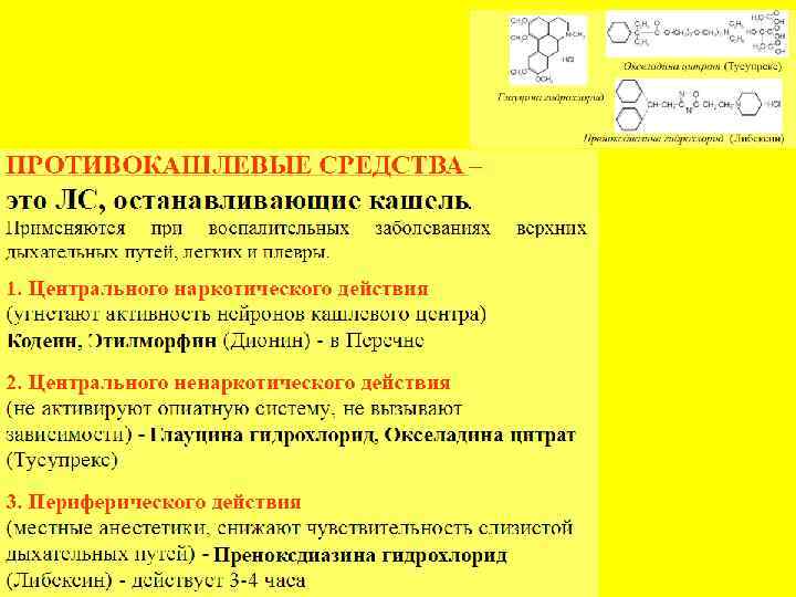 • • ПРОТИВОКАШЛЕВЫЕ ПРЕПАРАТЫ Применяют при неудержимом кашле и тогда, когда кашель мешает обычному физическому состоянию, например, мешает спать. Однако подавление кашля мешает выделению мокроты и ухудшает состояние больных с хроническим бронхитом и бронхоэктазами. Взрослым возможно применение кодеин содержащих препаратов. Кодеин (codeine)эффективное противокашлевое средство, но вызывает привыкание. Применяют при сухом и кашле, диарее, болях в грудной клетке; его не рекомендуют применять при БА, тяжелых поражениях печени и почек, лекарственной; и алкогольной зависимости. Противопоказание. Дыхательная недостаточность. Побочные эффекты. Запор, угнетение дыхания, особенно в больших дозах. Дозы и применение. 15— 30 мг 2— 4 раза/сут. • Кодтерпин (Россия); табл. (кодеина 15 мг). • Кодипронт (Heinrich Mack Nachf. Gmb. H & Co. KG, Германия); капс. ретард (кодеина 30 мг).