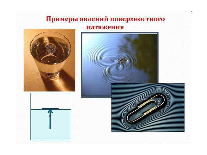 • Клоп-водомерка умело использует силу поверхностного натяжения, удерживающую его на поверхности воды. Он не тонет, поскольку вес клопа меньше силы поверхностного натяжения.