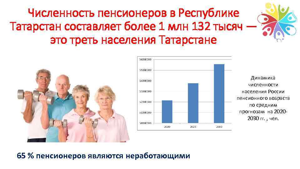 Численность пенсионеров в Республике Татарстан составляет более 1 млн 132 тысяч — это треть населения Татарстане Динамика численности населения России пенсионного возраста по средним прогнозам на 20202030 гг. , чел. 65 % пенсионеров являются неработающими