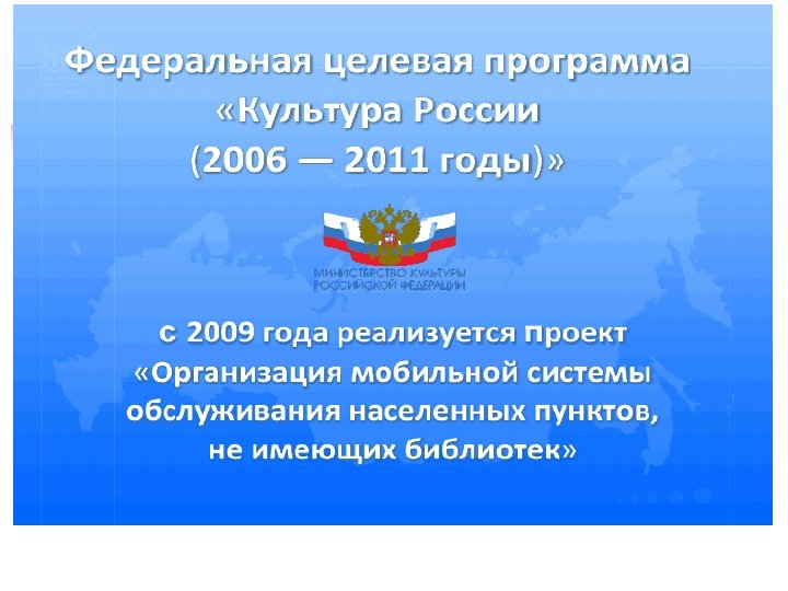 Основные документы. n n ФЗ «О библиотечном деле» (1994 г. ) Распоряжение Правительства РФ от 13. 07. 2007 г. № 923 -р «Изменения, которые вносятся в социальные нормативы и нормы, одобренными распоряжением правительства РФ от 03. 07. 1996 № 1063» n Модельный стандарт деятельности публичной библиотеки от 22. 05. 2008 г. o ГОСТ 7. 0 -99 Информационно-библиотечная деятельность, библиография. Термины и определения o Руководство по мобильным библиотекам/Международная федерация библиотечных ассоциаций и учреждений (ИФЛА)