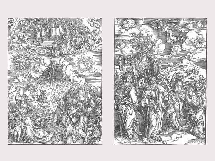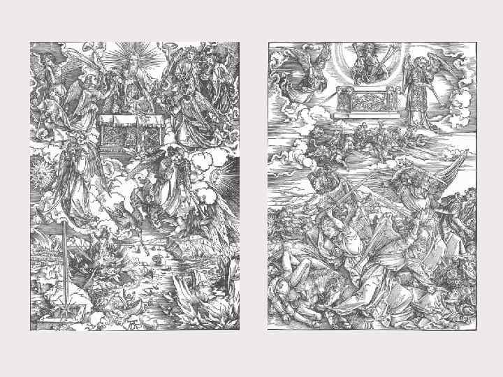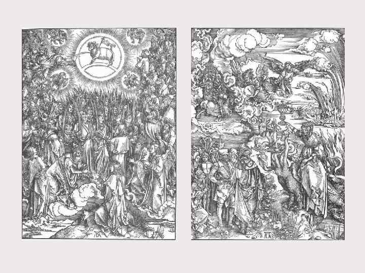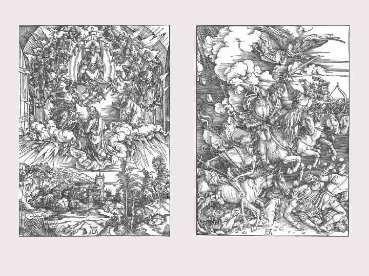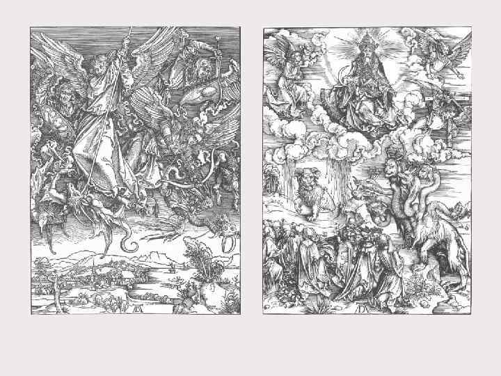 Альбрехт Дюрер (1471 -1528) – великий мастер ксилографии. • Дюрер стал первым немецким художником, кто работал одновременно в обоих видах гравюры — на дереве и на меди. Необычайной выразительности он достиг в ксилографии, реформировав традиционную манеру работы и использовав технические приёмы, сложившиеся в гравюре на металле. До Дюрера в ксилографии господствовал контурный рисунок, он же передавал форму предметов, объём и светотень с помощью разнообразных штрихов, всё это усложняло задачу резчика гравюры. Дюрер имел возможность пользоваться услугами лучших резчиков Нюрнберга, однако, по мнению части исследователей, некоторые гравюры он резал сам. В конце 1490 -х годов Дюрер создал ряд превосходных ксилографий, в том числе один из своих шедевров — серию гравюр на дереве «Апокалипсис» (1498), являющихся удачным сочетанием позднеготического художественного языка и стилистики итальянского Возрождения.