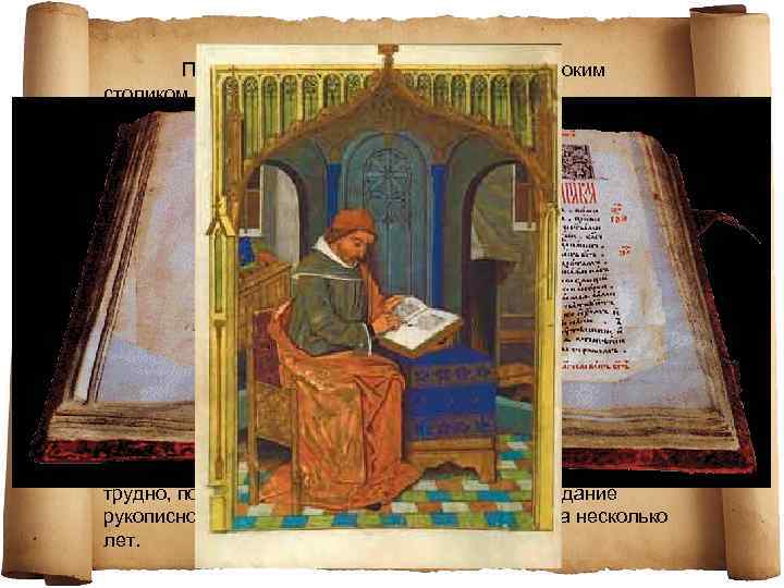 Писец сидел на табуретке рядом с невысоким столиком, на котором располагались письменные принадлежности. Пергамент он держал на коленях. Перед написанием текста пергамент разлиновывался с помощью линейки и шильца, а с XVI века для линования листов стали применять рамку с натянутыми на ней нитями. Сушили чернила, присыпая их песком. Рукописная книга имела форму кодекса и состояла из сложенных вдвое листов пергамента. Сначала текст переписывался чернилами, а затем в оставленные пустые места вписывались красные строки. Особый мастер-художник украшал книгу заставками и миниатюрами. После этого книга попадала в руки переплетчику, который сшивал листы и делал переплет. Переплетом служили две доски, обтянутые кожей, иногда бархатом или парчой. К переплету прикрепляли выпуклые бляхи из металла. Некоторые книги помещали в оклад. Его украшали драгоценными камнями. Книга получалась большой и тяжелой. Держать ее в руках было трудно, поэтому при чтении ее клали на стол. Создание рукописной книги занимало много времени, иногда несколько лет.