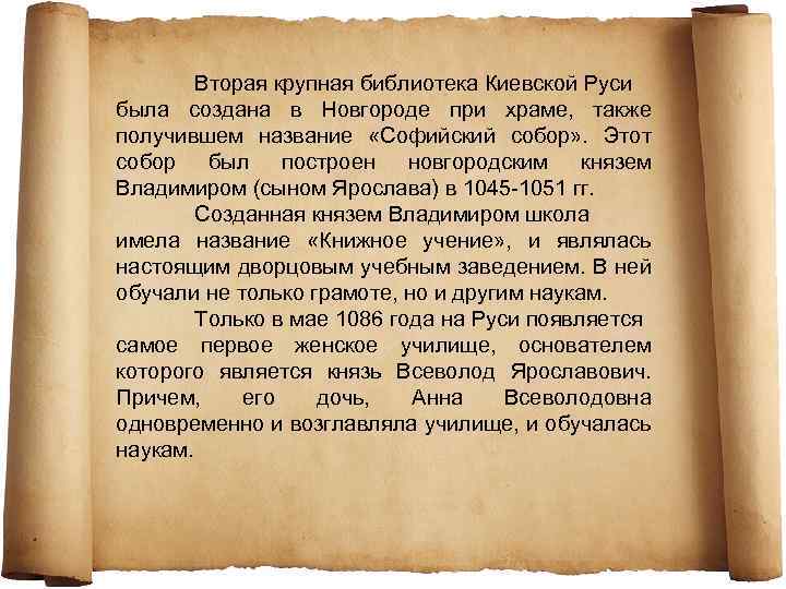Вторая крупная библиотека Киевской Руси была создана в Новгороде при храме, также получившем название «Софийский собор» . Этот собор был построен новгородским князем Владимиром (сыном Ярослава) в 1045 -1051 гг. Созданная князем Владимиром школа имела название «Книжное учение» , и являлась настоящим дворцовым учебным заведением. В ней обучали не только грамоте, но и другим наукам. Только в мае 1086 года на Руси появляется самое первое женское училище, основателем которого является князь Всеволод Ярославович. Причем, его дочь, Анна Всеволодовна одновременно и возглавляла училище, и обучалась наукам.