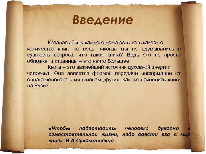 Введение Казалось бы, у каждого дома есть хоть какое-то количество книг, но ведь никогда мы не вдумывались в сущность вопроса, что такое книга? Ведь это не просто обложка, и страницы – это нечто большее. Книга – это важнейший источник духовной энергии человека. Она является формой передачи информации от одного человека к миллионам других. Как же появились книги на Руси? «Чтобы подготовить человека духовно к самостоятельной жизни, надо ввести его в мир книг» . В. А. Сухомлинский
