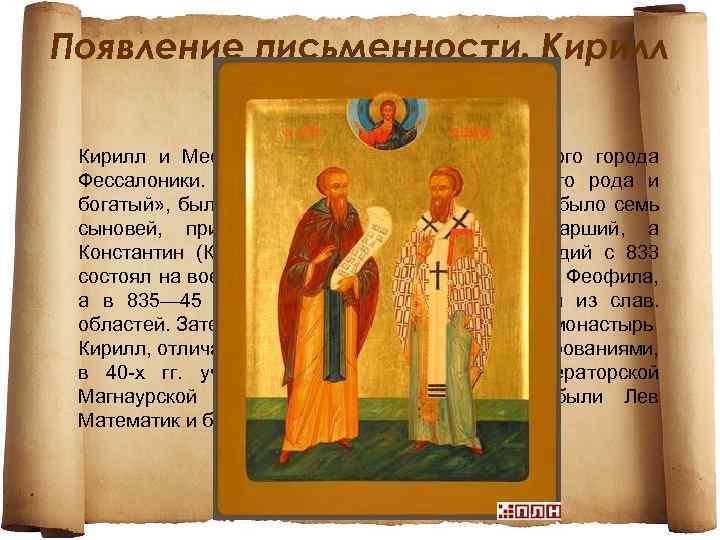 Появление письменности. Кирилл и Мефодий происходили из византийского города Фессалоники. Их отец по имени Лев, «хорошего рода и богатый» , был друнгарием при стратиге. В семье было семь сыновей, причём Михаил (Мефодий) — старший, а Константин (Кирилл) — младший из них. Мефодий с 833 состоял на военной службе при дворе императора Феофила, а в 835— 45 был правителем (архонтом) одной из слав. областей. Затем Мефодий удалился в Вифинский монастырь Кирилл, отличавшийся с детства выдающимися дарованиями, в 40 -х гг. учился в Константинополе в императорской Магнаурской школе, где его наставниками были Лев Математик и будущий патриарх Фотий.