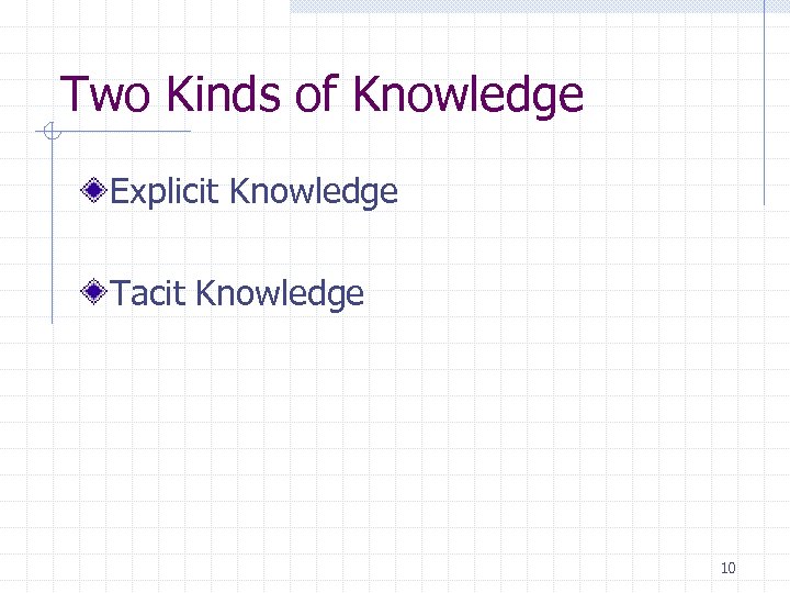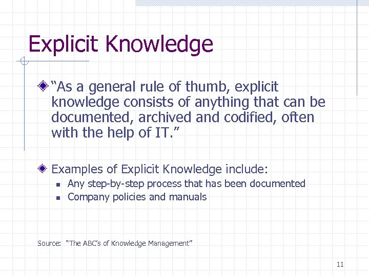Two Kinds of Knowledge Explicit Knowledge Tacit Knowledge 10