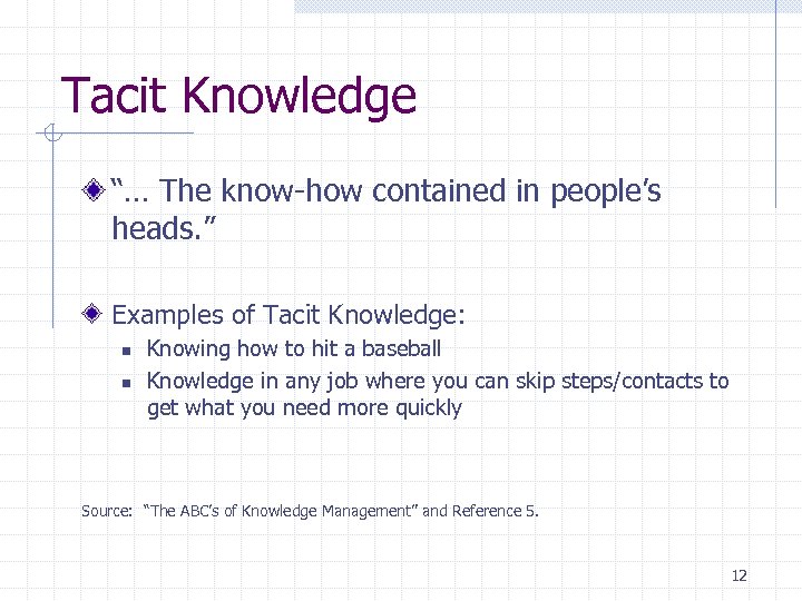 Tacit Knowledge “… The know-how contained in people’s heads. ” Examples of Tacit Knowledge: n n Knowing how to hit a baseball Knowledge in any job where you can skip steps/contacts to get what you need more quickly Source: “The ABC’s of Knowledge Management” and Reference 5. 12