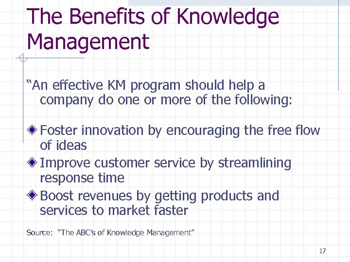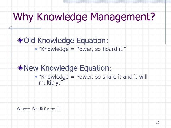 Why Knowledge Management? Old Knowledge Equation: w “Knowledge = Power, so hoard it. ” New Knowledge Equation: w “Knowledge = Power, so share it and it will multiply. ” Source: See Reference 1. 16