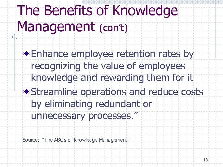 The Benefits of Knowledge Management “An effective KM program should help a company do one or more of the following: Foster innovation by encouraging the free flow of ideas Improve customer service by streamlining response time Boost revenues by getting products and services to market faster Source: “The ABC’s of Knowledge Management” 17