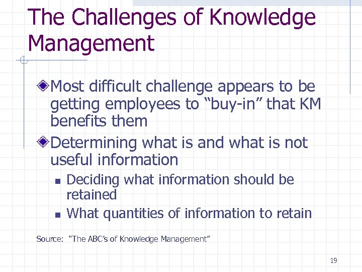 The Benefits of Knowledge Management (con’t) Enhance employee retention rates by recognizing the value of employees knowledge and rewarding them for it Streamline operations and reduce costs by eliminating redundant or unnecessary processes. ” Source: “The ABC’s of Knowledge Management” 18