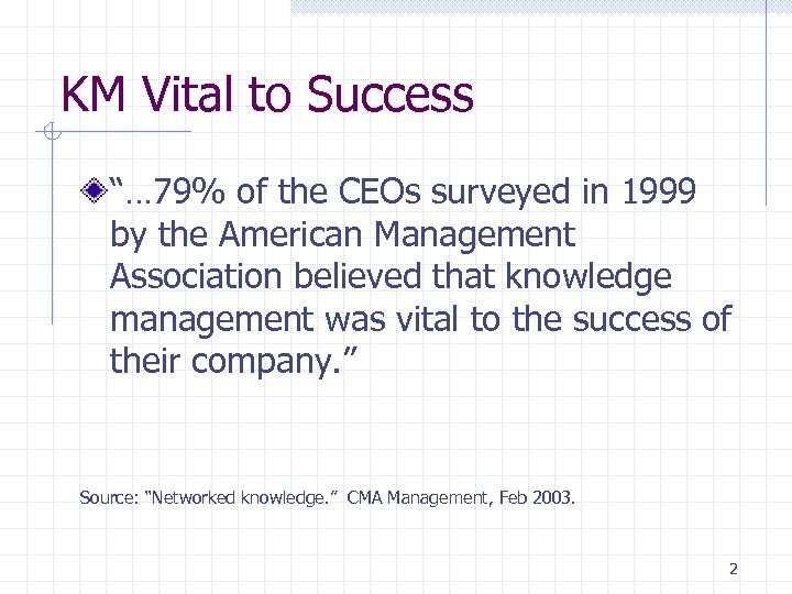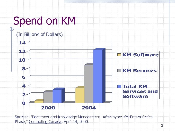 KM Vital to Success “… 79% of the CEOs surveyed in 1999 by the American Management Association believed that knowledge management was vital to the success of their company. ” Source: “Networked knowledge. ” CMA Management, Feb 2003. 2