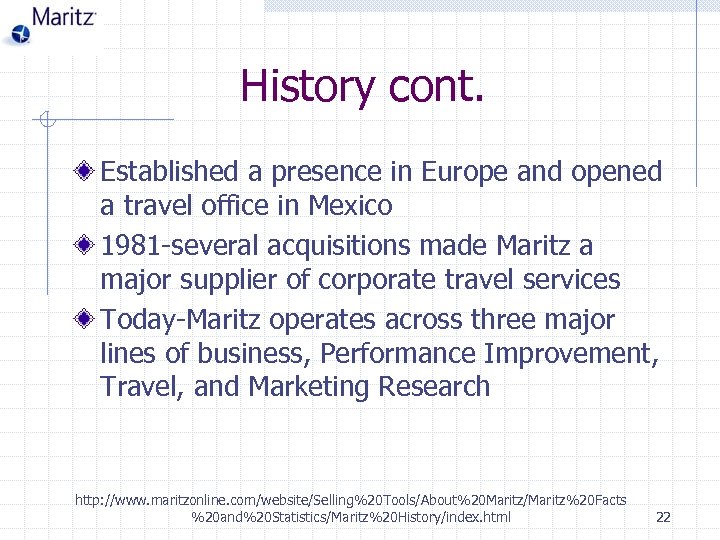 History cont. Established a presence in Europe and opened a travel office in Mexico 1981 -several acquisitions made Maritz a major supplier of corporate travel services Today-Maritz operates across three major lines of business, Performance Improvement, Travel, and Marketing Research http: //www. maritzonline. com/website/Selling%20 Tools/About%20 Maritz/Maritz%20 Facts %20 and%20 Statistics/Maritz%20 History/index. html 22