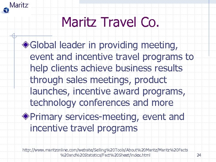 Maritz Performance Improvement Co. World’s largest provider of incentive services to improve the performance of employees, channel partners, and customers who use the client’s products. Primary services-merchandise and travel awards, learning systems, communications, and fulfillment Primary industries served-automotive, telecommunications, financial services, and hi tech http: //www. maritzonline. com/website/Selling%20 Tools/About%20 Maritz/Maritz%20 Facts %20 and%20 Statistics/Fact%20 Sheet/index. html 23