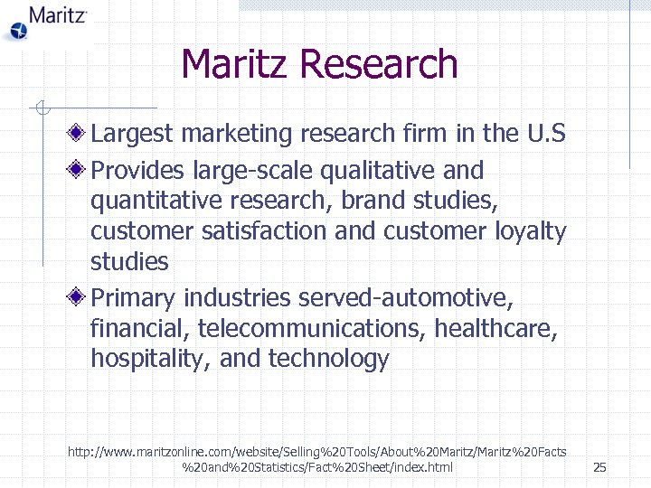 Maritz Research Largest marketing research firm in the U. S Provides large-scale qualitative and quantitative research, brand studies, customer satisfaction and customer loyalty studies Primary industries served-automotive, financial, telecommunications, healthcare, hospitality, and technology http: //www. maritzonline. com/website/Selling%20 Tools/About%20 Maritz/Maritz%20 Facts %20 and%20 Statistics/Fact%20 Sheet/index. html 25