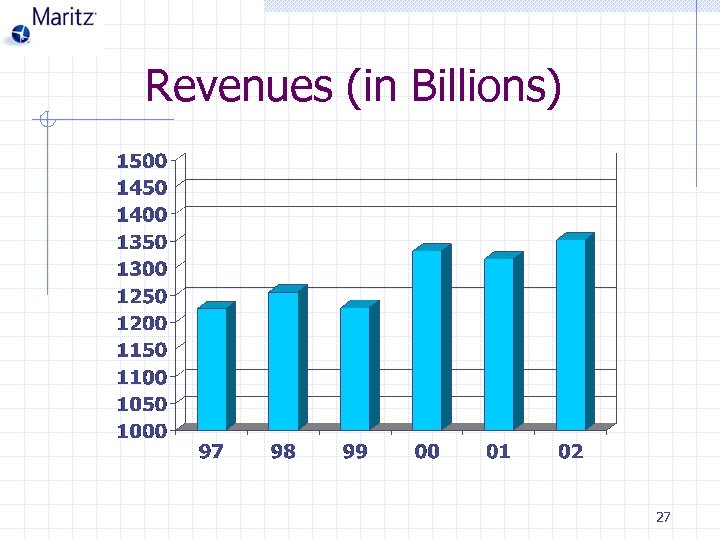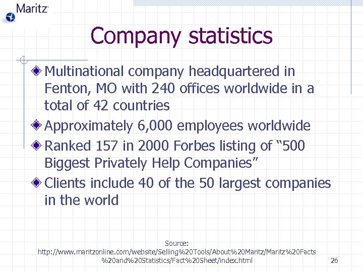 Company statistics Multinational company headquartered in Fenton, MO with 240 offices worldwide in a total of 42 countries Approximately 6, 000 employees worldwide Ranked 157 in 2000 Forbes listing of “ 500 Biggest Privately Help Companies” Clients include 40 of the 50 largest companies in the world Source: http: //www. maritzonline. com/website/Selling%20 Tools/About%20 Maritz/Maritz%20 Facts %20 and%20 Statistics/Fact%20 Sheet/index. html 26