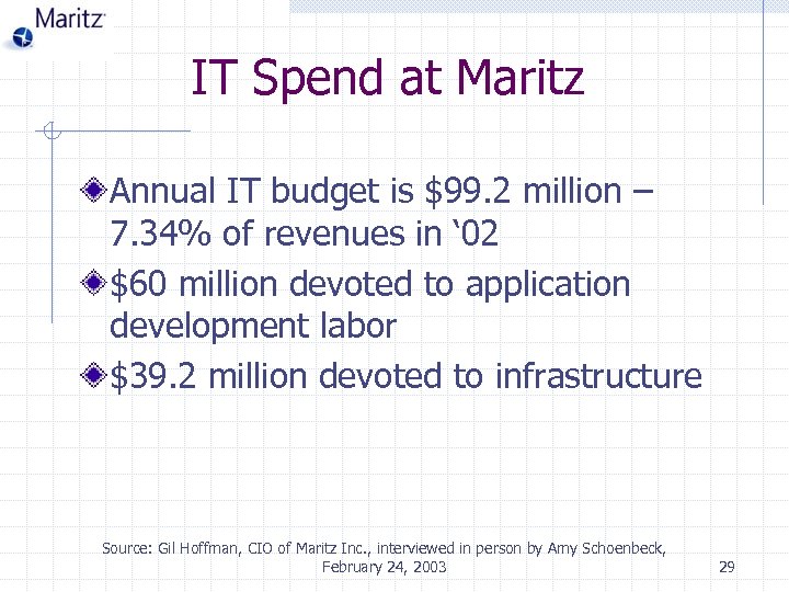 IT at Maritz 700 FT domestic employees Additional 125 employees located in Canada and UK 58 contractors devoted to application development Source: Gil Hoffman, CIO of Maritz Inc. , interviewed in person by Amy Schoenbeck, February 24, 2003 28