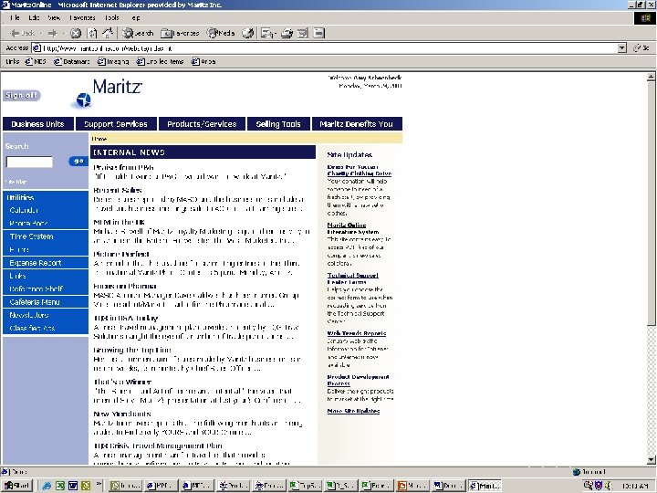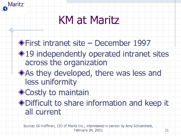 KM at Maritz First intranet site – December 1997 19 independently operated intranet sites across the organization As they developed, there was less and less uniformity Costly to maintain Difficult to share information and keep it all current Source: Gil Hoffman, CIO of Maritz Inc. , interviewed in person by Amy Schoenbeck, February 24, 2003 31