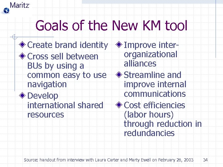 Mission “To help generate revenue and profit by providing an easy-to-use repository of tools and information for Maritz people whose job is to understand, sell, and profitably deliver our product/service offering” Source: handout from interview with Laura Carter and Marty Ewell on February 26, 2003 33