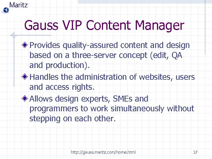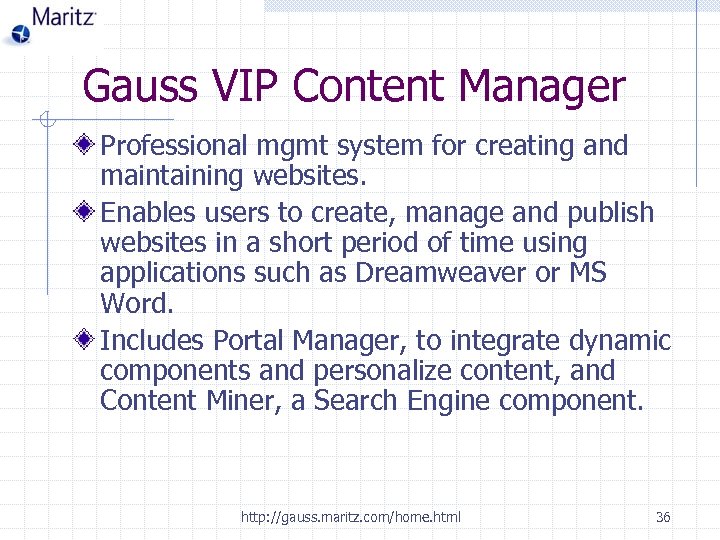 Gauss VIP Content Manager Professional mgmt system for creating and maintaining websites. Enables users to create, manage and publish websites in a short period of time using applications such as Dreamweaver or MS Word. Includes Portal Manager, to integrate dynamic components and personalize content, and Content Miner, a Search Engine component. http: //gauss. maritz. com/home. html 36