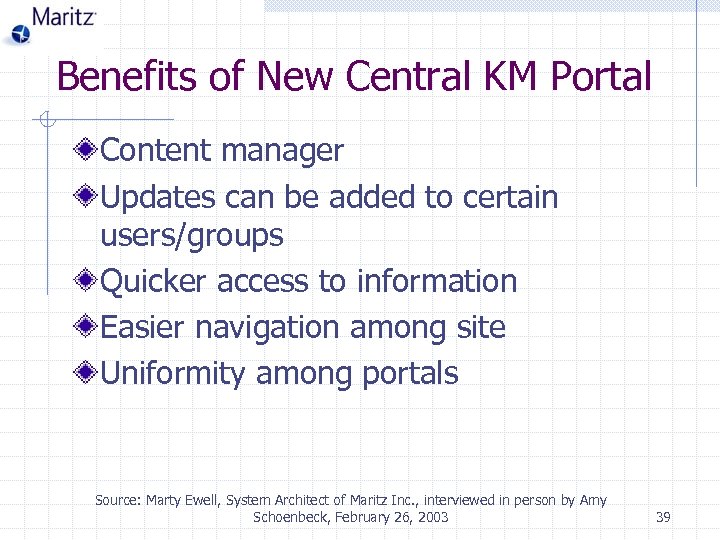 Benefits of New Central KM Portal Content manager Updates can be added to certain users/groups Quicker access to information Easier navigation among site Uniformity among portals Source: Marty Ewell, System Architect of Maritz Inc. , interviewed in person by Amy Schoenbeck, February 26, 2003 39