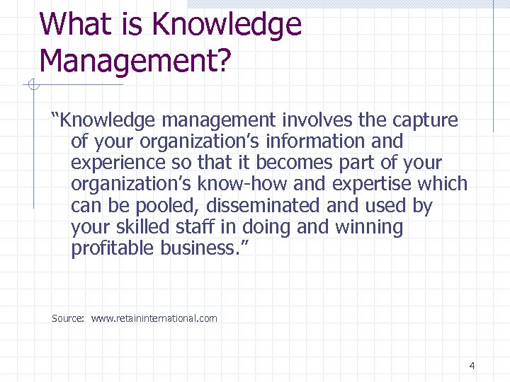 What is Knowledge Management? “Knowledge management involves the capture of your organization’s information and experience so that it becomes part of your organization’s know-how and expertise which can be pooled, disseminated and used by your skilled staff in doing and winning profitable business. ” Source: www. retaininternational. com 4