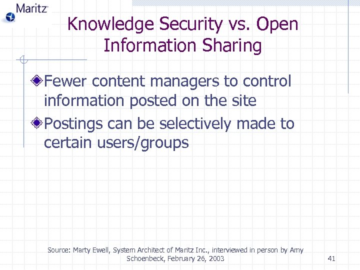 Knowledge Security vs. Open Information Sharing Fewer content managers to control information posted on the site Postings can be selectively made to certain users/groups Source: Marty Ewell, System Architect of Maritz Inc. , interviewed in person by Amy Schoenbeck, February 26, 2003 41