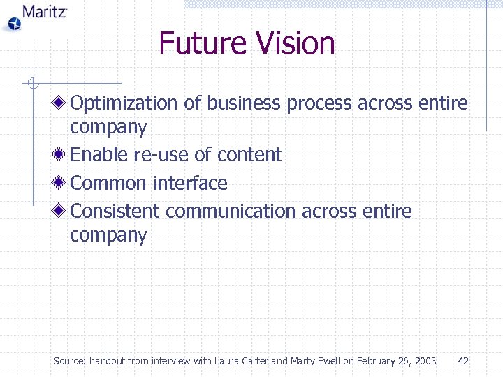 Future Vision Optimization of business process across entire company Enable re-use of content Common interface Consistent communication across entire company Source: handout from interview with Laura Carter and Marty Ewell on February 26, 2003 42