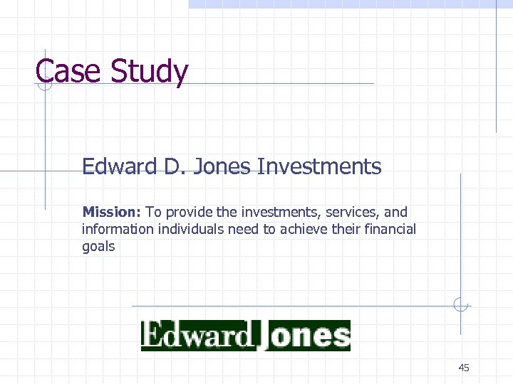 Case Study Edward D. Jones Investments Mission: To provide the investments, services, and information individuals need to achieve their financial goals 45